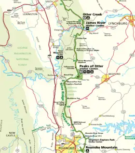 Map of Blue Ridge Parkway from James River to Roanoke