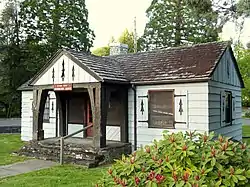 In 1986 the station building was in excellent condition. It is a one-story wood-frame building on a concrete foundation, with gables, timbers, and stone steps. Decorative features include pine tree shaped cutouts in shutters and pine tree designs centered in each gable end.[2][3]:24