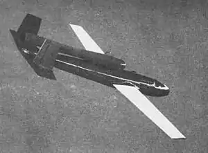 The KD2G was a mid-wing, twin-tailed aircraft of similar design to the KDG Snipe which Globe was already supplying to the Navy. A single McDonnell PJ42 pulsejet engine was mounted atop the rear of the fuselage.[1] The fuselage was constructed of steel tubing with a duralumin monocoque covering; dural was also used for the flying surfaces.[2] The KD2G was equipped with radio control with an effective range of 6,000 yards (5,500 m); it could be launched using a catapult, or launched aerially from JD-1 or F7F-2D aircraft.[2] Recovery, if it survived its mission, was by a 32-foot (9.8 m) diameter parachute; the Firefly was designed to be able to float for up to 15 minutes in the event of a water landing.[2]