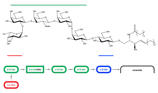 Defined by the monoclonal antibody MBr1, Globo H has been isolated from breast cancer cell line MCF-7, and its structure has been determined through several analyses, including NMR spectroscopy and methylation analysis.[5] Globo H consists of a hexasaccharide of the structure Fucα(1-2)Galβ(1-3)GalNAcβ(1-3)Galα(1-4)Galβ(1-4)Glcβ(1) with a ceramide attached to its terminal glucose ring at the 1 position in a beta linkage.[6]
