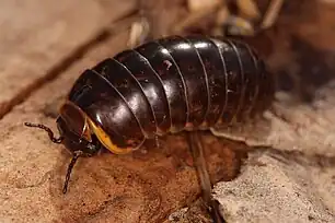 Glomeris klugii exhibits a wide range of colour variation. Many colour morphs and subspecies exist, each displaying unique colour patterns.[2] The base colour of the species typically ranges from light brown to red,[2] with many possessing vividly coloured chitin and a distinct marbled pattern.[3] However, the presence of black freckles on their bodies varies, with some individuals having freckles that fuse into larger spots, while others are fully black in colour.[2] G. klugii can reach a length of about 13.5 mm (0.53 inches) and a width of up to 6.25 mm (0.24 inches).[3] Telopods exhibit syncoxite with slight variations in the central lobe shape and delicately bifurcated coxal horns.[3] G. klugii also lacks a main stria on the thoracic shield.[2]