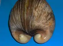 A view of the umbonal area of Glossus humanus, the oxheart clam