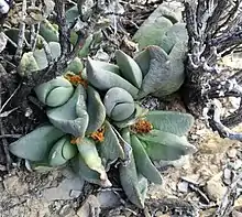 The leaves of this species are thick, oval or rounded-elliptical, and ending in a slightly hunched "chin". The leaves also have clear margins and a pale waxy covering that can easily be rubbed off. This layer of white wax gives the leaves a slightly blue-grey hue. It is likely an adaptation to this plant's habitat preference for exposed positions in full sunlight.[2]