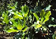 Evergreen trees growing up to 35 m tall. The trees have a 6-8 mm thick bark that is greyish-brown and smooth, with a pink blaze from which acrid, black sap exudes. The leaves are simple and alternate characteristically clustered at the tips of branchlets giving the appearance of a whorl. The leaves, with 1-2 cm long stout, winged petiole, have a blade that is 8-18 cm long by 3.5 to 7 cm wide. The leaf shape is elliptic ovate to obovate or spathulate, with cuneate or attenuate base and blunt or emarginate apex. The margin is entire and the leaves are thick and glabrous (non-hairy). The leaves have 13-18 pairs of prominent lateral nerves and distinct secondaries.[2] The cream-coloured flowers are bisexual, about 8 mm in diameter, and arranged in axillary and terminal panicles, with a spathaceous and deciduous calyx. The flowers have 4-6 petals with 4-6 stamens, threadlike style, and a single-celled superior ovary with one ovule. The fruit is a round drupe, about 2.5-3.5 cm, brown in colour and scurfy.[2]