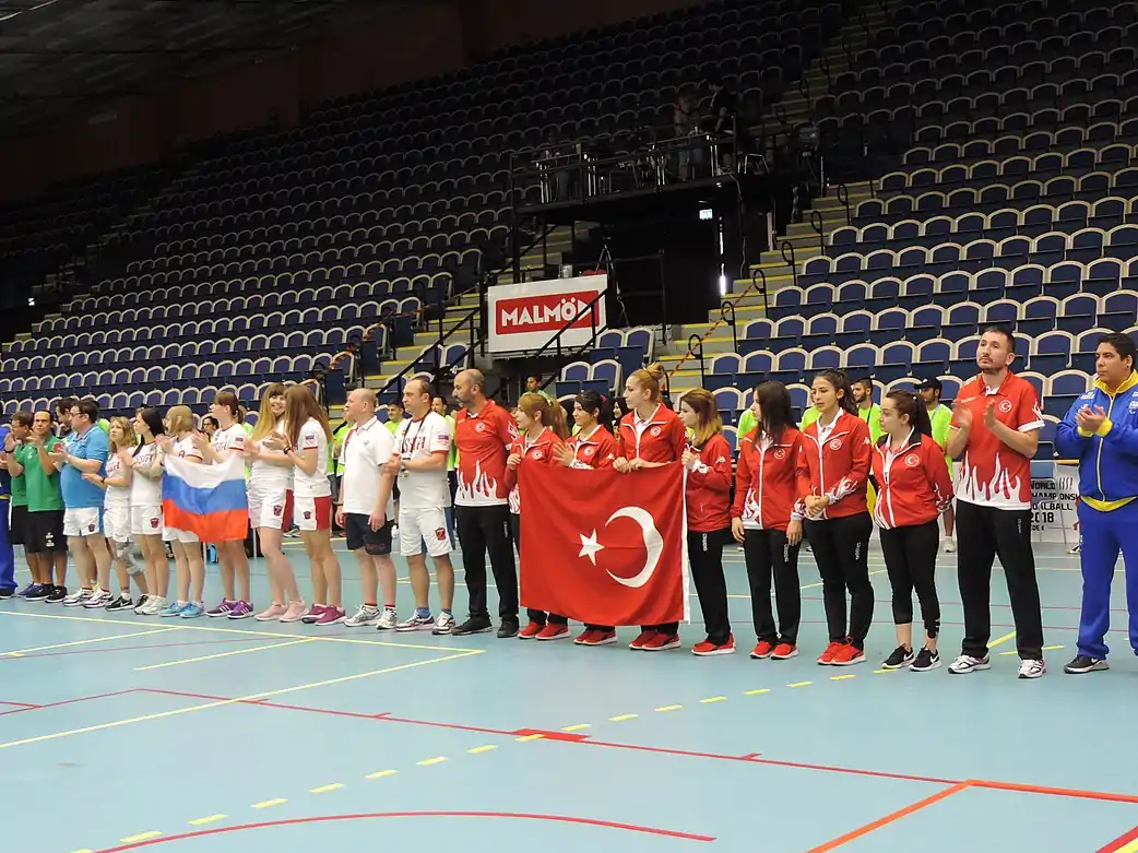 Finalists of the women's division of the 2018 IBSA Goalball World Championships in Malmö, Sweden. Shows gold medal Russia (mid), silver medal Turkey (right), and start of bronze medal Brazil (left).