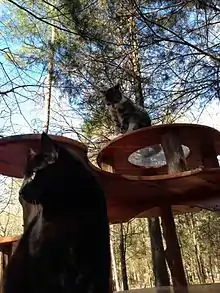 The Goathouse Refuge in Pittsboro, North Carolina, is a nonprofit no-kill animal sanctuary for cats that is run on a volunteer-basis. The refuge is cage-free, with the cats roaming around within the boundaries of the property.[2] Founded in 2007 by Italian-born artist Siglinda Scarpa, the refuge can hold up to 300 cats on a 16-acre farm. There is an art gallery located on the first floor of the house where Scarpa sells her handmade art such as pottery, sculptures, and cookware to help support the refuge.[3]