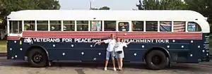 On August 7, 2005, the group arrived in Crawford, Texas in a bus provided by Veterans for Peace, painted red, white and blue with the words "Veterans For Peace Impeachment Tour" on it and demanded to talk with President Bush. Prior to arriving at Crawford, the group had been in Dallas attending a Veterans for Peace convention.