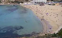 Golden Bay (Maltese: Il-Mixquqa) is one of the bays and sand beaches in Malta. It was previously known as Military Bay.[1] The white beach slopes gently allowing swimmers to easily walk into the sea. In summer months, there are lifeguards on duty. Golden Bay is the most popular tourist beach of the Manikata region. Several beach clubs and a large hotel are located on the beach. The Ghajn Tuffieha International Scout Campsite is also located nearby offering an all-year-round camping experience for everyone.[2] A bus terminus and car park are located at Golden Bay.[1]