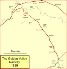 The Golden Valley Railway was a railway company which constructed a branch line from Pontrilas in Herefordshire, England, to Hay on Wye. Pontrilas was on the Great Western Railway main line between Newport and Hereford. The Golden Valley company opened the first part of its line from Pontrilas to Dorstone in 1881. It was constantly beset with shortage of money, but opened an extension to Hay in 1889. Its directors had grand ideas of extending further to Monmouth and forming part of a long-distance trunk route. It issued misleading promotional material which secured significant investment from the public, but exposure of the falsehoods resulted in collapse.