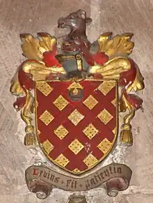 The coat of arms of William Vardon of Goldstone Hall (1783–1856), lord of the manor of Goldstone, from his memorial inside St. Swithun's Church, Cheswardine. The heraldry of the shield is Or, Fretty Gules, illustrating the connection with the de Verdun/Verdon family of Alton, Staffordshire; the crest of a stag's head should have antlers, but these broke off many years ago