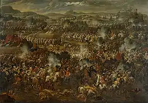 The second painting depicts The relief of the city of Esztergom (At Dorotheum Vienna auction of 4 October 2000, lot 177). The painting which is signed and dated 1686 depicts the battle against Turkish forces for the relief of Esztergom (called 'Gran' in German), now in Hungary, which took place in August 1685. The Christian troops were under the command of Charles V, Duke of Lorraine and the elector Maximilian II Emanuel, Elector of Bavaria. This picture like the first one offers a bird's eye view on several planes of the intense fighting between the Christian and Turkish forces.[6]