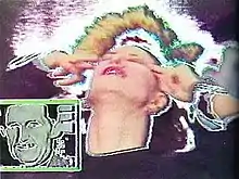 George Plimpton hosted the show, which combined live and taped segments with TV graphics designed by Paik. John Cage, in New York, produced music by stroking the needles of dried cactus plants with a feather,[1] accompanied by video images from Paris. Charlotte Moorman recreated Paik's TV Cello. Laurie Anderson and Peter Gabriel performed a new composition, "Excellent Birds" (later released on Anderson's album Mister Heartbreak and Gabriel's So, retitled "This Is the Picture (Excellent Birds)" on the latter). The broadcast also featured the television premiere of the video Act III, with music by Philip Glass.[2] The Thompson Twins performed their song "Hold Me Now."[3] Oingo Boingo played its song "Wake Up (It's 1984)" to an audience that presumably had recently woken up on the first day of 1984. Others contributing to the project included poets Allen Ginsberg and Peter Orlovsky, choreographer Merce Cunningham, and artist Joseph Beuys.