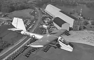 The original concept of an all-fabric inflatable aircraft was based on Taylor McDaniel's inflatable rubber glider experiments in 1931. Designed and built in only 12 weeks, the Goodyear Inflatoplane was built in 1956, with the idea that it could be used by the military as a rescue plane to be dropped in a hardened container behind enemy lines. The 44 cubic ft (1.25 cubic meter) container could also be transported by truck, jeep trailer or aircraft.[1] The inflatable surface of this aircraft was actually a sandwich of two rubber-type materials connected by a mesh of nylon threads, forming an I-beam. When the nylon was exposed to air, it absorbed and repelled water as it stiffened, giving the aircraft its shape and rigidity. Structural integrity was retained in flight with forced air being continually circulated by the aircraft's motor. This continuous pressure supply enabled the aircraft to have a degree of puncture resilience, the testing of airmat showing that it could be punctured by up to six .30 calibre bullets and retain pressure.[2][3]