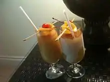 Goombay Smash is a rum based beverage in the Bahamas.[1] It is traditionally served in a sling or collins glass. The Goombay Smash was created by Emily Cooper, aka Miss Emily, at the Blue Bee Bar in New Plymouth. The original recipe is a secret, but it is believed to have contained coconut rum, dirty rum, apricot brandy, and pineapple juice.[1] Imitators and variations commonly use rum, coconut and pineapple juice.[1] Apricot liqueur is sometimes used and dark, amber or spiced rums (dirty rums) are preferred. In place of coconut rum, coconut cream can be used. Other variations include Creme de Banana, orange juice and grenadine.[1]