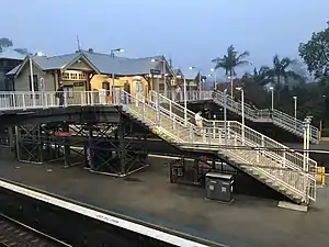 Gordon Railway Station was opened on 1 January 1890.[3] In 1909 the single line was duplicated between Hornsby and St. Leonard's. At Gordon, during the duplication the original single platform and station building were replaced by a new island platform with a standard brick island-platform style station building. The island platform served the Up North Shore line and the Down North Shore line. A third platform was built at Gordon (the Local Platform) adjacent to the Up line. This platform allowed for termination of local trains at Gordon. At the time of duplication, an overhead footbridge and booking office was built which allowed local residents to cross from one side of Gordon to the other and allowed access to the platforms via sets of steps.[2]