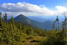 The Gorgany range is mostly strongly-layered sedimentary rock (a type called flysch), that fractures into debris fields known locally as 'gorgan'.[1] The full vertical range of the central Carpatians are represented, with altitudes in the park ranging from 710 to 1754 meters above sea level.[2] The range runs from northwest to southeast, on Cretaceous and Quaternary conglomerates, sandstones, clay and marls. There are 30 mountain streams in the park, forming a dense network that feed into the Bystrytsia River. The steep landscape, formed in the Wurzburg glaciation, is covered with coniferous forests.
