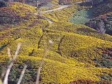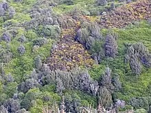 The introduction resulted in large spreading infestations over hundreds of hectares, peaking in the late 1940s. It was recognised as a threat as early as 1861 with the Provincial Council in Nelson passing an act to prevent the planting of gorse hedges.[3] The seed can lie dormant on the ground for up to 50 years, germinating quickly after the adults have been removed. Unfortunately, most methods of removing adult gorse plants, such as burning or bulldozing them, create the ideal conditions for the gorse seeds to germinate and total eradication with current technology seems impossible. Gorse is now one of the most widely recognised agricultural weeds in New Zealand. It covers 700,000 hectares (1,700,000 acres) at varying densities — a total of 5% of the land area of New Zealand when excluding existing indigenous forest, vegetated sub-alpine and alpine areas.[4] Gorse became New Zealand's most costly weed to control, an estimated $22 million per annum by the early 1980s.[5]