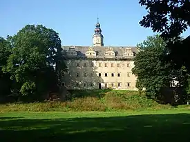 The Castle has historical associations with Cardinal Ernst Adalbert of Harrach (1598–1667), the bishop of Trent, who in his Italian diaries for 1663–1664 refers to Grafenort alternately as Arnsdorff, Arnßdorff, or Arnßdorf,[3] and the composer Ignaz Reimann (1820–1885; buried at the nearby Krosnowice).[4] The poet and actor Karl von Holtei (1798–1880) who began his career as an actor at Grafenort Castle mentions it repeatedly in his pleasantly amusing, light-hearted biography, Vierzig Jahre ("Forty Years").[5] He says he spent thirty years of his life in the Castle; on a return visit he muses about the rooms