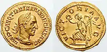 Aureus of Decius. Obv.: IMP C M Q TRAIANVS DECIVS AVG. Rev.: Victoria holding wreath and palm, VICTORIA AVGG. 4,32 gr.