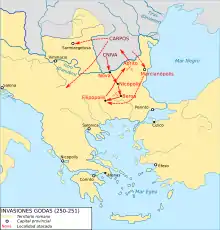To deal with this chaotic situation, Philip appointed the senator Decius as commander of the legions quartered in Pannonia and Moesia.[9][10] Upon arrival in this region, as recounted by Jordanes, Decius found it impossible to restrain the invaders and preferred to release his soldiers from military service.[8] The soldiers rebelled and presented themselves to Ostrogotha requesting his protection, which was granted, joining the invading forces. Ostrogotha's Gothic subcommanders, named Argedo and Gunderico, were sent to sack Moesia again, subsequently heading for the fortified city of Marcianopolis in Thracia. After a long siege, they forced the villagers to give them money to cease their attack.[11] After this, Ostrogotha withdrew to his country with the spoils.[12]