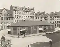 For many years most of the square was occupied by a bunker surrounded by parking spaces.[3] On 7 June 1968 it became car-free as part of first expansion of the pedestrian zone around Strøget; a number of air raid shelters left over from World War II were removed, as well as parking places.[4] According to architects Jan Gehl and Lars Gemzøe the square was not initially very popular, but gradually became more and more popular, especially among students from the nearby University of Copenhagen. By the 1980s the square "was crowded almost beyond capacity throughout the outdoor season,"[4] although it has lost some of its popularity in recent years and is a comparably peaceful place now.