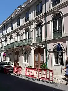 In its first years, the Grémio had several headquarters, always in the Chiado area, including Palácio Quintela. Finally, in 1875, it settled in the mansion of the Viscount of Loures, on Rua de S. Francisco (now Rua Ivens). This is a fine example of the architecture of Portuguese Romanticism. The interior has an eclectic range of artistic styles, including a variety of textile coverings on the ground floor; the Green Room with an imperial style; a Victorian bar; a smoking room with carved wooden panelling; and a room in a neo-Louis XV style.[2][3]