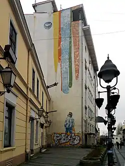 Mural in Rajićeva before the 2018 renovation. Grčka Kraljica is the indented building on the left, with the side entrance into the former disco club Zvezda