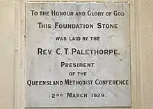 In 1928, the Church Trustees empowered Walter Taylor to devise plans for a new church on the corner of Verney and Oxley Roads. The foundation stone was laid on Saturday 2 March 1929 at a ceremony presided over by the President of the Queensland Methodist Conference, Rev. C. T. Palethorpe.[4] Like the hall, the construction of the former church was a community effort, with the donation of labour, cash and much of the construction material including filling, fencing, concrete foundations, reinforcing steel, bearers, floor joists, timber for roof construction and cathedral glass for windows. The congregation had intended to complete the superstructure of the former church without borrowing any money, however the economics of the time were against them. Being the time of the Depression, many of the men of the parish were unemployed, on relief work, and so were unable to give money as generously as they had done in the past. £500 was borrowed from the Methodist Loan Fund.[1]