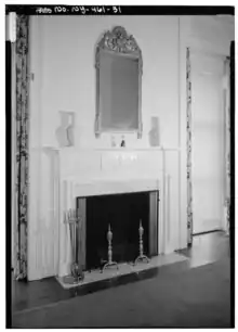 The rooms of the main house retain the same layout as in 1811, although the designs of each room has been changed over the years.[354] Prior to 1942, the house was used as a museum and had a restroom in the basement, a museum curator's office on the first floor, and a park supervisor's apartment on the second floor.[88] Following the 1980s renovation, the mansion was redecorated with 19th-century chandeliers, mirrors, and other artifacts.[110] The mansion includes around 14 rooms[347][18] and eight bathrooms.[18][355] In general, the rooms have wall dados, fireplaces, plain cornices, and high ceilings.[354] The fireplaces in the house largely have classical designs with a mantelpiece shelf supported by tapering vertical pilasters.[356]