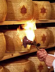 Like parmesan, Grana Padano is a semi-fat hard cheese which is cooked and ripened slowly for at least nine months. If it passes quality tests, it is fire-branded with the Grana Padano trademark. The cows are milked twice a day.[7] Milk produced in the evening is skimmed to remove the surface layer of cream and mixed with fresh milk produced in the morning. The partly skimmed milk is transferred into copper kettles and coagulated; the resulting curd is cut to produce granules with the size of rice grains, which gives the cheese its characteristic texture, and then warmed to 53–56 °C (127–133 °F). It is produced year-round, and varies seasonally as well as by year. Though similar to parmesan cheese, the younger Grana Padano cheeses are less crumbly, milder and less complex in flavor than the better-known, longer-aged parmesan.[1]