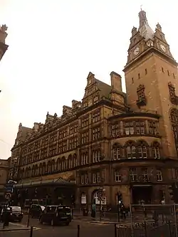 The hotel was designed by Robert Rowand Anderson, in 'Queen Anne style'; he also furnished the public rooms.[2] The hotel was constructed by the Caledonian Railway and was completed in 1883 as the Central Station Hotel. It was extended, along with the station, in 19011906.[2] The hotel extension was designed by James Miller and it opened on 15 April 1907.[2] It was later renamed the Central Hotel. The world's first long-distance television pictures were transmitted to the hotel on 24 May 1927 by John Logie Baird.[3]
