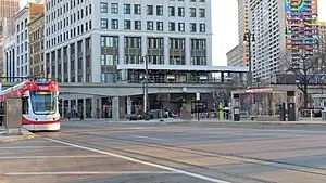 Grand Circus Park station is a public transit station in Downtown Detroit, Michigan that services both the Detroit People Mover and the QLine.[2] The station takes its name from the adjacent Grand Circus Park. It is also the terminus of the D2A2 commuter bus to Ann Arbor, and serves as a transfer point to SMART's FAST Michigan and Woodward express bus lines.