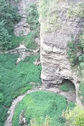 Grand Gulf State Park is a state-operated, privately owned and publicly accessible, geologic preserve near Thayer, Missouri, United States, encompassing a forked canyon that is the remnant of an ancient collapsed dolomite cave system.[5] The land that is now the park was acquired by conservationist Leo Drey (1917–2015) before becoming part of the Missouri state parks system. The 322-acre (130 ha) state park has been operated by the Missouri Department of Natural Resources under a lease agreement with the L-A-D Foundation since 1984.[6] Grand Gulf was declared a National Natural Landmark in 1971 as an excellent example of karst topography and underground stream piracy.[7] A 60-acre (24 ha) portion of the park was designated by the state as the Grand Gulf Natural Area in 1986.[8]