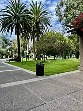 Grand Hope Park is located on the Los Angeles campus of the Fashion Institute of Design & Merchandising.[1] The park was designed as a collection of "outdoor rooms"[4] with the purpose of "bringing functional art and nature to an urban setting."[10] Its built in elements are diverse enough to form a mixed metaphor due to its mixture of greenery (including cypress, willow, feather and fan palm, pine, jacaranda and sycamore).[11] It consists of decorative sidewalks, two fountains, a clock tower, pergolas, a children's playground, and displays of various artists' works.[12] The artwork in the park was contributed from Lita Albuquerque, Adrian Saxe, Raul Guerrero, Gwynn Murrill, Tony Berlant, and Ralph McIntosh. The mosaic adorned clock tower at the park's entrance was designed by Halprin with musical compositions from John Carter, Michael McNabb, and Ushio Torikai used to mark each hour.[1]