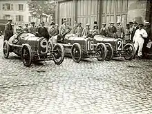 A prototype test car was constructed, tested and modified[22] after which three team cars were assembled at the Sunbeam Wolverhapmpton Experimental Department.[23] For the purpose of the Grand Prix the three Works team cars were designated Sunbeam I, II and III for Jean Chassagne (riding mechanic Robert Laly), Major H.O.D. Segrave (riding mechanic Jules Moriceau), K. Lee Guinness (riding mechanic Bill Perkins) respectively.[42] The prototype test car became the Strasbourg team spare and was driven in practice by all three team members;[7][43] "Guinness, Chassagne and myself [Segrave] put any amount of time on the course".[44]