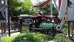 The Grand Sierra Railroad is a 2 ft miniature steam locomotive themed Peanuts train ride located in the Camp Snoopy area of Knott's Berry Farm in Buena Park, California. The four minute train ride transport guests on a journey around reflection lake and the surround camp snoopy and Fiesta Village.[1] The ride opened in the 1983 season as part of the opening of Camp Snoopy. The train ride was previously longer prior to the opening of Silver Bullet. When Silver Bullet opened on December 7, 2004, the track layout of the Grand Sierra Railroad was shortened in the Reflection Lake area. In 2014, the ride underwent a refurbishment in cooperation with Garner Holt Productions and opened with small animatronic and figures from the Peanuts characters as part of Camp Snoopy's 30th anniversary.[2] Moreover, during Knott's Spooky Farm, the Grand Sierra Railroad undergoes a family friendly Halloween themed overlay with characters from the Peanuts comic strip. There is also a peanuts celebration overlay during Knott's Peanuts Celebration. Riders must be 46 inch tall to ride by themselves, or no height restriction if accompanied by an adult.