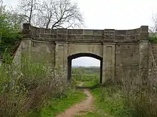 Finally in 1810, work started under the direction of John Thomas. Surprisingly, the decision was taken to start in the middle, with a 2+12-mile (4 km) section of the main line and the 9-mile (14 km) branch to Tiverton. The logic for this was that there was a large potential trade in limestone between quarries at Canonsleigh and Tiverton, and this would generate income.[9] The summit level was cut 16 feet (5 m) lower than the original plans, so that no locks would be required, but this greatly increased the amount of earthworks required.[10] A further Act was obtained in 1811 to sanction this, and to re-route the canal near Halberton,[11] where Rock Bridge was constructed to carry the road over the canal.[12] The same engineers that built the canal also built a substantial country house,[13] turnpike house[14] and cottages[15] at the site. Several other bridges, including Batten's Bridge,[16] Crownhills Bridge,[17] Greenway Bridge[18] and Sellick Bridge[19] were also constructed at Halberton to carry minor roads over the canal.