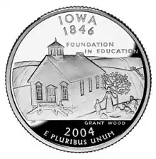 2004 Iowa state quarter honoring Grant Wood. Elements depicted include: the Schoolhouse, teacher and students planting a tree, (caption): "Foundation in Education", and Grant Wood.