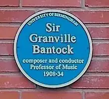 Early conducting engagements took him around the world with a musical comedy troupe. With his brother Leedham Bantock he wrote a couple of music hall songs which met with some success.[6] He founded a music magazine, The New Quarterly Music Review,[2] but this lasted only a few years. In 1897, he became conductor at the New Brighton Tower concerts,[2] where he promoted the works of Joseph Holbrooke, Frederic Hymen Cowen, Charles Steggall, Edward German, Hubert Parry, Charles Villiers Stanford, Corder and others, frequently devoting whole concerts to a single composer. He was also conductor of the Liverpool Orchestral Society with which he premiered Delius's Brigg Fair on 18 January 1908. He became the principal of the Birmingham and Midland Institute school of music in 1900.[2] He was a close friend of fellow composer Havergal Brian. He was Peyton Professor of Music at the University of Birmingham from 1908 to 1934 (in which post he succeeded Sir Edward Elgar).[2][7] In 1934, he was elected Chairman of the Corporation of Trinity College of Music in London. He was knighted in 1930.[2] His students included Anthony Bernard, Lilian Elkington, Eric Fogg and Dorothy Howell.