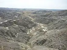 The East Block of the park is located about an hour's drive south of Assiniboia on the south side of the Wood Mountain Hills in Census Division No. 3. The interpretive centre is in the McGowan House at the new Rock Creek Campground and the information centre is at the museum in Wood Mountain Regional Park.[11] The East Block is more of a wilderness area but has views of the badlands of Rock Creek, the Cretaceous–Paleogene boundary, and prairie skies. A one-lane, 11-kilometre (6.8 mi) parkway traverses the Rock Creek Badlands.[12] The East Block contains the Grasslands National Park (east) (SK 023) Important Bird Area.[13]