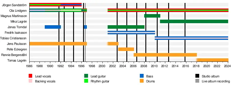 - Ola Lindgren – lead vocals (1995–1996, 2001–present), rhythm guitar (1992–1996, 2001–present), lead guitar (1986–1996), bass (1986–1989, 1995–1996), backing vocals (1986–1995)