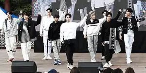 The nine members of GreatGuys—Jaei, Uiyeon, Horyeong, Daun, Baekgyeol, Donghwi, Hwalchan, Haneul, and Dongin—were trainees for three years.[1][2] The name of the group signifies their ability to be "show a cool image on and off stage".[3] With an average height of 185 centimetres (6.07 ft), they have been dubbed "the tallest idols".[4] The nonet released their debut synth-pop digital single album Last Men and its title track on August 25, 2017.[5] They held a showcase in Japan the following January.[6] A tropical dance song, GreatGuys' second single album Ganda and eponymous title track was released on April 7, 2018.[7] Main vocalist Daun contributed to the song's lyrics and Dongin wrote the rap portions of the track.[8] A Japanese version was issued two months later.[9] GreatGuy attended the 2018 Asia Model Awards, where they received the Rookie of the Year Award.[10]