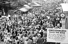 Beginning in the 1950s, musical concerts and performances held during Fair week starting drawing major acts and large crowds. Roy Rogers and Lawrence Welk appeared during the 1960s, as did Johnny Carson and a touring version of Rowan & Martin's Laugh-In.[18] Andy Williams introduced the Osmond Brothers in 1964.[18] In 1964, Kate Smith made her first "community fair" performance at the Allentown Fair.[18] Herb Alpert and the Tijuana Brass headlined in 1966, and the back cover of their album S.R.O. even featured a photograph taken during their performance.[18] On August 8, 1974, Liza Minnelli delayed her concert while Richard Nixon's resignation speech listen was broadcast live over the public address system.[18] Her performance later that night broke box office records at the Allentown Fair.[18]