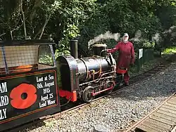 Following the periods of hand operation and then pony haulage, a pair of steam locomotives were delivered from Stephen Lewin of Poole in 1877. Ant and Bee were 0-4-0 tank locomotives made unusually narrow, in order to fit within the adit.[4] They were 4 ft 9 in (1.45 m) high and only 3 ft (0.91 m) wide. Their two 4×6 in inside cylinders had Bagnall-Price valve gear and a geared drive to the rear axle, but coupling rods between the axles. The arrangement of the water tanks was particularly unusual, being a front tank ahead of the smokebox, in order to reduce width. The boilers were launch-type, as were commonly used for small locomotives with insufficient space between the frames for a conventional firebox.[4]
