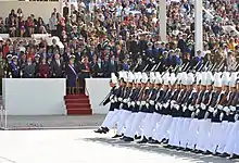 For more than a century the Military Parade of Chile or Great Military Parade of Chile (Spanish: Gran Parada Militar de Chile or Parada Militar de Chile) has been a tradition within the Independence Day holidays in Chile.[1] It is held in Santiago, Chile's O'Higgins Park on September 19 yearly in honor of the Glories of the Chilean Army with a military parade involving not just the ground forces but by the rest of the Chilean Armed Forces: the Chilean Navy, the Chilean Air Force, and the Carabineros de Chile. It is also in honor of the anniversary of the formal inauguration on that day in 1810 of the First Government Junta, which witnessed the first military parade of the independent nation at the Plaza de Armas, Santiago. It is the final act of the national independence celebrations, which are broadcast through TV and the Internet and radio.