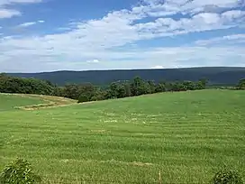 Great North Mountain is oriented along a northeast-southwest axis from its southern terminus along the North Fork Shenandoah River in Rockingham County, Virginia to its northern terminus at U.S. Route 522 in Frederick County, Virginia. In the south, the initial 7 miles (11 km) of the ridge is known Church Mountain.[2] For much of its length, the mountain forms the border between Virginia and West Virginia, in two separate stretches; starting 7 miles (11 km) north of its southern terminus at the border of Hardy County, West Virginia, Rockingham County, Virginia and Shenandoah County, Virginia, for 26 miles (42 km) with a 4.5-mile (7.2 km) break where the border shifts east to Paddy Mountain around Wilson Cove, followed by an additional 14-mile (23 km) stretch to the north.