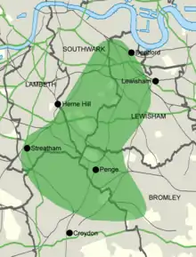 The Great North Wood was a natural oak woodland that started three miles (4.8 km) south-east of central London and scaled the Norwood Ridge. At its full extent, the wood's boundaries stretched almost as far as Croydon and as far north as Camberwell. It had occasional landownings as large clearings, well-established by the Middle Ages such as the hamlets of Penge and Dulwich.