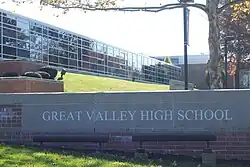Great Valley High School is a comprehensive, college preparatory, public high school located in eastern Chester County. It is located in East Whiteland Township,[2] near Malvern, Pennsylvania. Located on the same campus as Great Valley Middle School at 225 North Phoenixville Pike,[3] it is the only high school within the Great Valley School District.