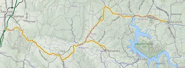 Officially opened in June 2012, it stretches for 134 km (83 mi) from Tallarook near Seymour, through Trawool, Yea and Bonnie Doon to Mansfield, with an offshoot to Alexandra from Cathkin.[1] Its highlights include the 200-metre (220 yd) Cheviot Tunnel near Yea, views of the Goulburn River, the Heritage listed Trawool Valley and a former rail bridge over Lake Eildon near Bonnie Doon.[1]