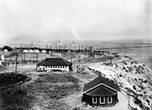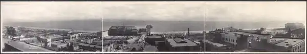 After taking nearly four months to round South America, the fleet made several stops in American waters on the Pacific Ocean. In port after port, thousands of citizens turned out to see and greet the fleet. In April 1908, 16 battleships anchored off of Coronado, California, in the San Diego area, and thousands of sailors and marines took part in a parade through San Diego's streets.[24] The fleet also stopped in Los Angeles and Santa Barbara. In May 1908, the fleet visited Monterey, California; the nearby Hotel Del Monte in Del Monte, California, hosted a grand ball for the officers of the fleet. After arriving in San Francisco on 6 May, most of the fleet took a side trip to Seattle and Tacoma, then returned to San Francisco.[25][26]